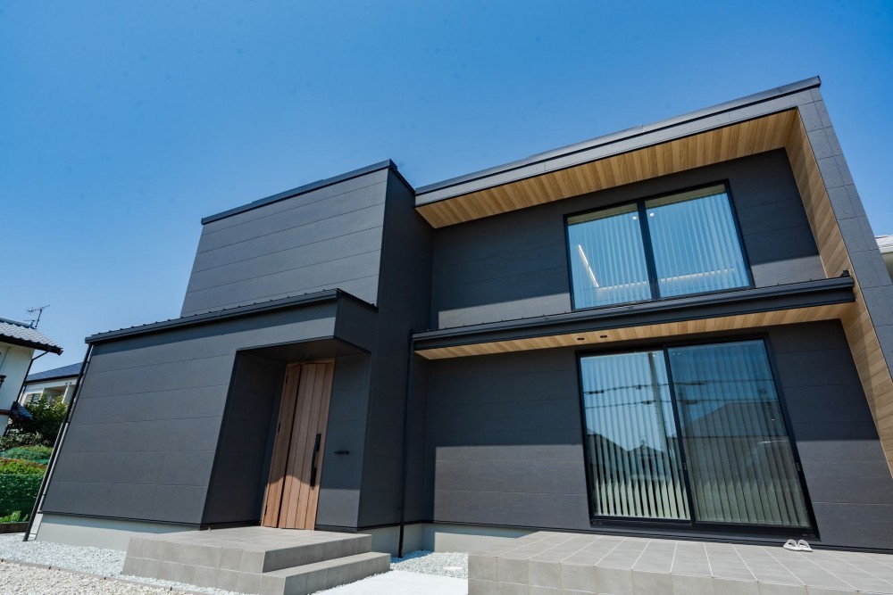 間取りは最初の提案から大きく変更なく決定。「外観デザインがめちゃくちゃ良くて、一目惚れでした」と語る通り、特に側面の木目調アクセントはデザイン性と機能性を両立し、Y様邸のシンボルとなっています。